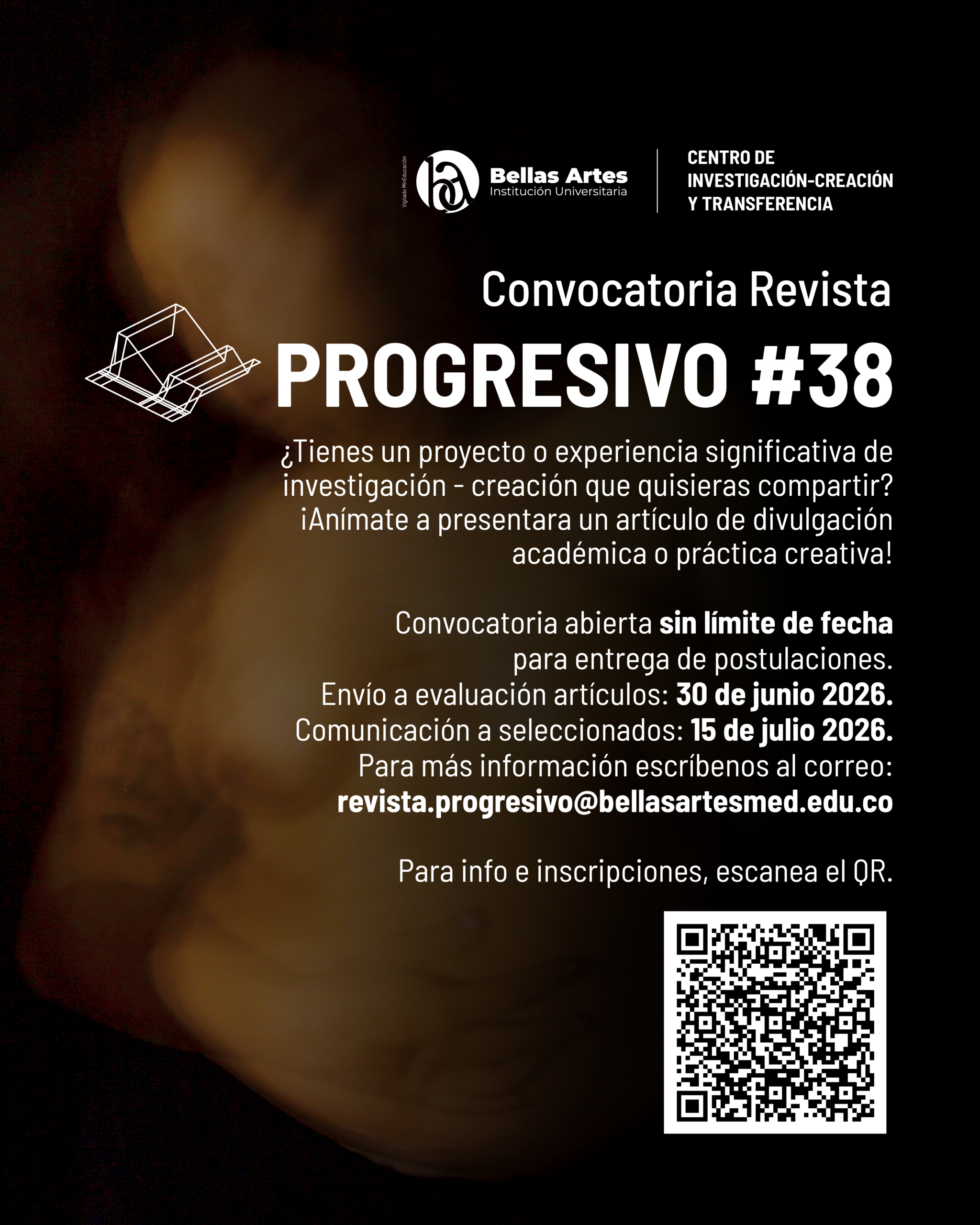 La Revista Progresivo de la Fundación Universitaria Bellas Artes invita a la comunidad académica y artística a compartir sus proyectos de investigación–creación y prácticas creativas.