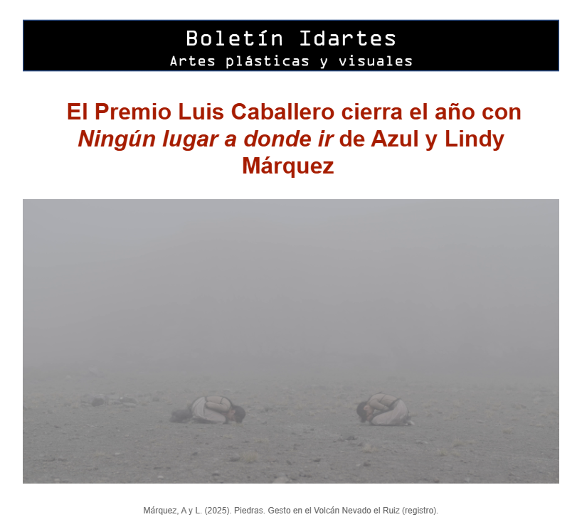 A partir del 13 de noviembre, la Galería Santa Fe abre sus puertas a Ningún lugar a donde ir, una propuesta expositiva de las artistas Azul y Lindy Márquez, nominadas al XIII Premio Luis Caballero. Esta muestra, que estará abierta al público hasta el 11 de enero de 2026, propone una experiencia inmersiva donde imagen, sonido y espacio se entretejen para hablar de la ausencia, la memoria y la persistencia del duelo colectivo, 40 años después de la tragedia de Armero.