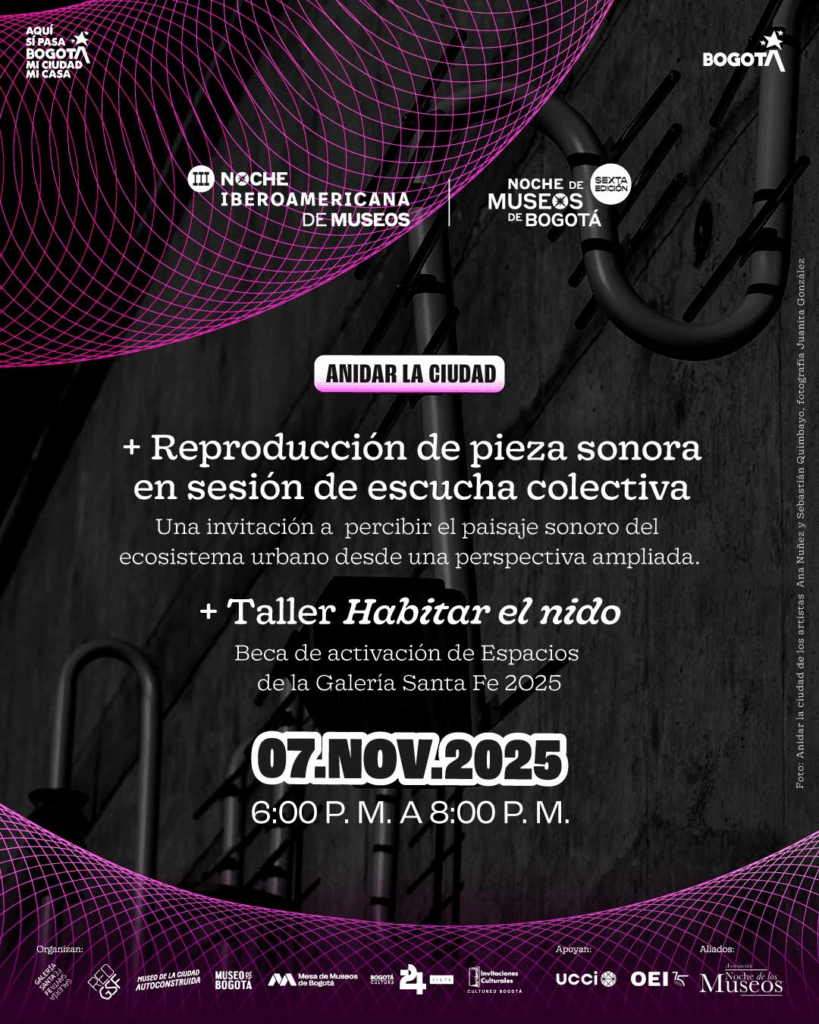Durante la Noche de los Museos, la Galería Santa Fe ofrece este encuentro con Ana Núñez y Sebastián Sandoval, creadores del proyecto Anidar la ciudad. Se propone una exploración del sonido como huella del ecosistema. Un taller para identificar paisajes sonoros urbanos y comprender el impacto de la contaminación acústica en las especies no humanas.