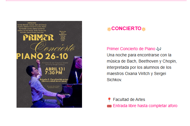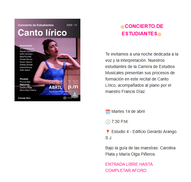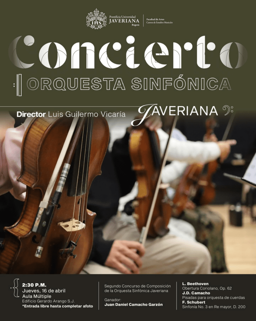 Te invitamos a un encuentro musical especial bajo la dirección del maestro Luis Guillermo Vicaría. En esta ocasión, la Orquesta presentará la obra ganadora del Segundo Concurso de Composición de la Orquesta Sinfónica Javeriana, creada por Juan Daniel Camacho Garzón.