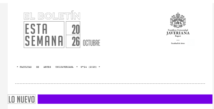 ![]() ![]() Encuentros y DesencuentrosENSAMBLE DE ÓPERA JAVERIANO Te invitamos a un viaje a través de las pasiones, los amores y las contradicciones humanas, interpretado por el Ensamble de Ópera Javeriano. Acompáñanos en esta puesta en escena donde la música y el teatro se entrelazan para explorar los lazos invisibles que nos unen y separan. 24 de octubre – 7:30 p.m. 25 de octubre – 6:30 p.m. Aula múltiple– Faculta de ArtesENTRADA LIBRE ![]() ![]() Sigue Temporada Jazz y Músicas Populares Acompáñanos en la #TemporadaOFF! El próximo miércoles 22 de octubre acompáñanos a escuchar al Ensamble de Improvisación libre con Santiago Botero y Nicolás Torres Proyecto. Aula Múltiple 1:00 p.m. ¡Una cita imperdible con la creación en vivo!Más Información![]() ![]() Conciertos de Estudiantes – Canto líricoEste martes 21 de octubre, acompáñanos a la muestra final de los estudiantes de la cátedra de Canto lírico. Estudio 3, Edificio Gerardo Arango S.J. (Facultad de Artes) 2:00 p.m. Pianistas: Javier Camacho y Francis Díaz Maestras: Carolina Plata y María Olga Piñeros¡Entrada libre!Más Información![]() Tus proyectos en nuestro TikTok![]() ¡Abrimos TikTok y queremos llenarlo con tus proyectos!Si eres estudiante, profesor o egresado de la Facultad de Artes, envíanos el registro en video de tu obra, proceso o creación artística (el formulario está en el link de la descripción). Nosotros nos encargamos de la edición ![]() . Esta nueva plataforma sera la vitrina de la creatividad de nuestra comunidad: música, teatro, danza, audiovisual, artes visuales, animación… ¡Todo cabe aquí!¡Síguenos!![]() REANUDACIONESExposición de Egresados![]() En el marco de los 30 años de la Facultad de Artes, celebramos con una exposición muy especial. El Departamento de Artes Visuales reúne a lxs egresadxs de la Carrera de Artes Visuales y la Maestría en Creación Audiovisual en la exposición de Reanudaciones, una muestra que congrega obras sencillas pero potentes, capaces de condensar gestos estéticos, políticos y poéticos. Una oportunidad para volver, reanudar y encontrarnos en comunidad .Abierta del 6 al 21 de octubre de 2025 Piso PP, Sala de Exposiciones – Edificio Gerardo Arango S.J¡Entrada libre!Postulate ![]() Temporada Jazz y Músicas Populares![]() Del 15 de octubre al 13 de noviembre, la Facultad de Artes presenta una nueva edición de la Temporada Jazz y Músicas Populares, una serie de conciertos en los que confluyen la improvisación, la experimentación y los cruces entre tradición y contemporaneidad. Participan: Big Band Javeriana, ensambles de Santiago Botero, Jorge Sepúlveda, Pedro Acosta, Ricardo Narváez, Fabio Ortiz, Néstor Vivas, Juan David Mojica, Abel Loterstein, Mónica Burbano, entre otrxs. Del 15 de octubre al 13 de noviembre de 2025 Aula Múltiple y Sala de Exposiciones– Facultad de Artes Entrada libre hasta completar aforoUna temporada para disfrutar la riqueza sonora y la creatividad de las músicas populares en diálogo con el lenguaje del jazz.Más Información ![]() Encuentro con el maestro Victoriano Valencia![]() En el marco del estreno de la Obra comisionada 2025 en la Sala de Conciertos de la Biblioteca Luis Ángel Arango, tendremos un encuentro especial con su compositor, Victoriano Valencia, docente de la Pontificia Universidad Javeriana. Lunes 27 de octubre 5:00 p.m.Auditorio Pablo VI En conversación con Iván Rodríguez (Tempo), exploraremos los procesos creativos detrás de la obra y la trayectoria de uno de los compositores más destacados del país. ¡Entrada libre y actividad abierta al público!Más Información ![]() ![]() Muestra del proyecto C[cósmico.avechuco]²El Aula Múltiple será escenario de la muestra final de C[cósmico.avechuco]², un proyecto de investigación que cruza el arte, el cuerpo y lo performativo para explorar nuevas formas de presencia y relación con lo cósmico. Octubre 23, 2025 – 7:00 p. m. Aula Múltiple – Facultad de Artes¡Entrada libre! Una experiencia escénica que expande los límites entre investigación y creación. Más Información![]() Estreno del documental Fihizca Uac – Alma Libre ![]() Nos alegra compartir el estreno del documental Fihizca Uac – Alma Libre, dirigido por Diego Chuquin, egresado de la Maestría en Creación Audiovisual de la Pontificia Universidad Javeriana, con la participación de los profesores Carolina Plata y Luis Gabriel Mesa. Este proyecto audiovisual es una exploración poética y espiritual que dialoga con las raíces, la memoria y la libertad del alma, combinando una mirada sensible con un lenguaje cinematográfico profundamente simbólico. El documental se proyectará como antesala de todas las películas presentadas en salas de Cine Colombia a nivel nacional, entre el 1 y el 15 de octubre de 2025.Más Información |