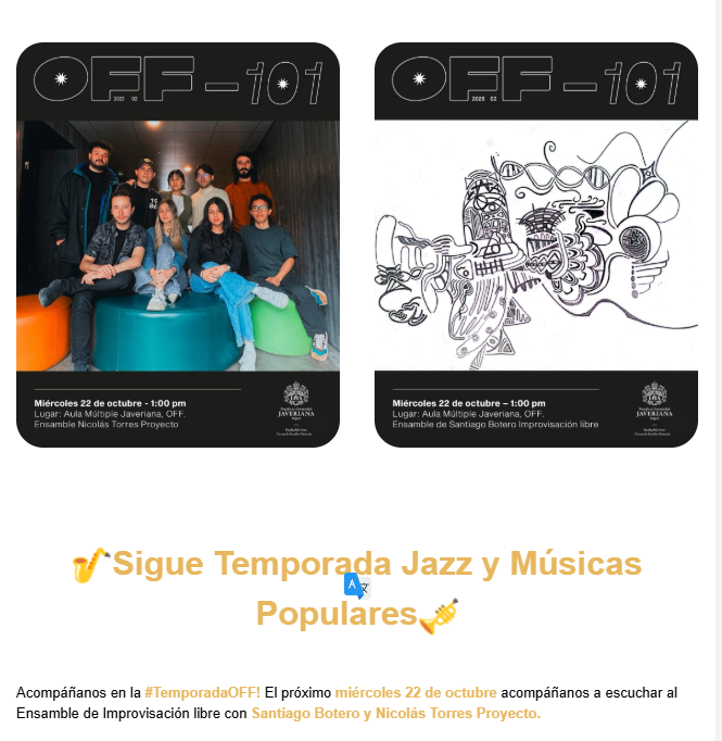 Temporada Jazz y Músicas Populares![]() Del 15 de octubre al 13 de noviembre, la Facultad de Artes presenta una nueva edición de la Temporada Jazz y Músicas Populares, una serie de conciertos en los que confluyen la improvisación, la experimentación y los cruces entre tradición y contemporaneidad. Participan: Big Band Javeriana, ensambles de Santiago Botero, Jorge Sepúlveda, Pedro Acosta, Ricardo Narváez, Fabio Ortiz, Néstor Vivas, Juan David Mojica, Abel Loterstein, Mónica Burbano, entre otrxs. Del 15 de octubre al 13 de noviembre de 2025 Aula Múltiple y Sala de Exposiciones– Facultad de Artes Entrada libre hasta completar aforoUna temporada para disfrutar la riqueza sonora y la creatividad de las músicas populares en diálogo con el lenguaje del jazz. |