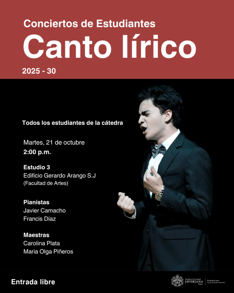 Conciertos de Estudiantes – Canto líricoEste martes 21 de octubre, acompáñanos a la muestra final de los estudiantes de la cátedra de Canto lírico. Estudio 3, Edificio Gerardo Arango S.J. (Facultad de Artes) 2:00 p.m. Pianistas: Javier Camacho y Francis Díaz Maestras: Carolina Plata y María Olga Piñeros¡Entrada libre! |