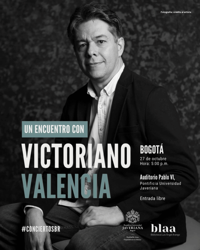 Encuentro con el maestro Victoriano Valencia![]() En el marco del estreno de la Obra comisionada 2025 en la Sala de Conciertos de la Biblioteca Luis Ángel Arango, tendremos un encuentro especial con su compositor, Victoriano Valencia, docente de la Pontificia Universidad Javeriana. Lunes 27 de octubre 5:00 p.m.Auditorio Pablo VI En conversación con Iván Rodríguez (Tempo), exploraremos los procesos creativos detrás de la obra y la trayectoria de uno de los compositores más destacados del país. ¡Entrada libre y actividad abierta al público! |