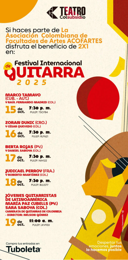 Queremos hacerle una invitación muy especial a la comunidad académica de las facultades asociadas a Acofartes, para que nos acompañen y aprovechen esta oportunidad de tener a algunos de los guitarristas más grandes de la actualidad, en recitales importantes, y diversos, en los que cada noche realmente son dos recitales, la primera parte la hace un guitarrista colombiano, todos de gran prestigio, y la segunda parte de cada gala la cierra un guitarrista internacional.