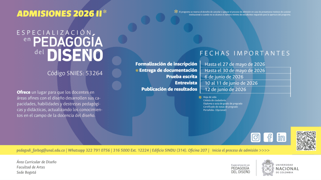 Inicia tu proceso de admisión a la Especialización en pedagogía del diseño en el siguiente link: Universidad Nacional de Colombia: Guía Paso a Paso – Posgrado