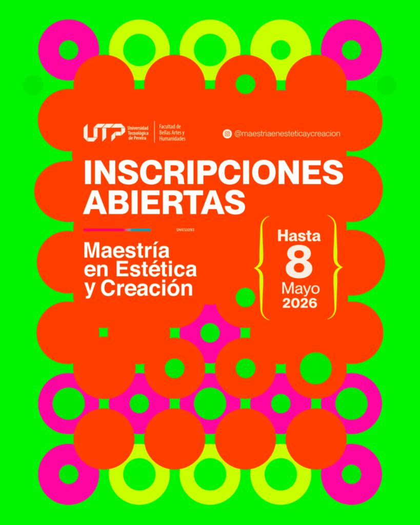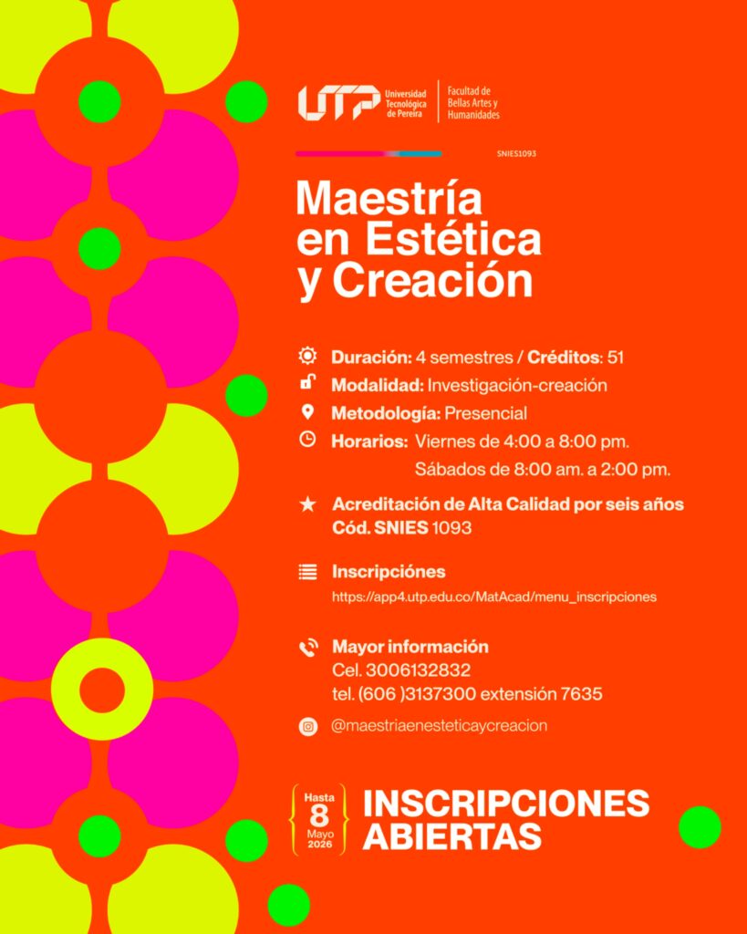 La Maestría en Estética y Creación de la Facultad de Bellas Artes y Humanidades de la Universidad Tecnológica de Pereira, tiene abiertas las inscripciones para la XI Cohorte del programa, hasta el 8 de mayo de 2025.